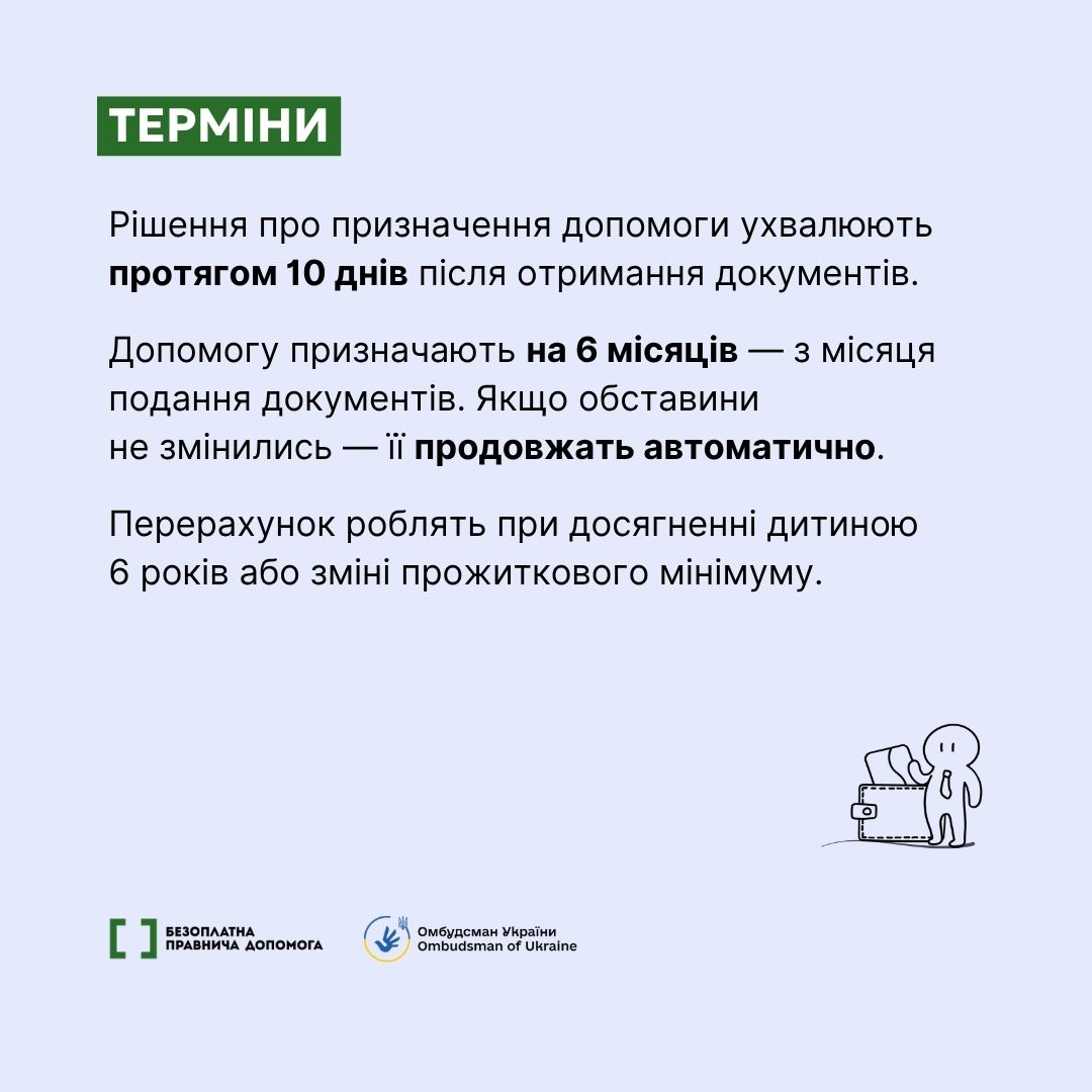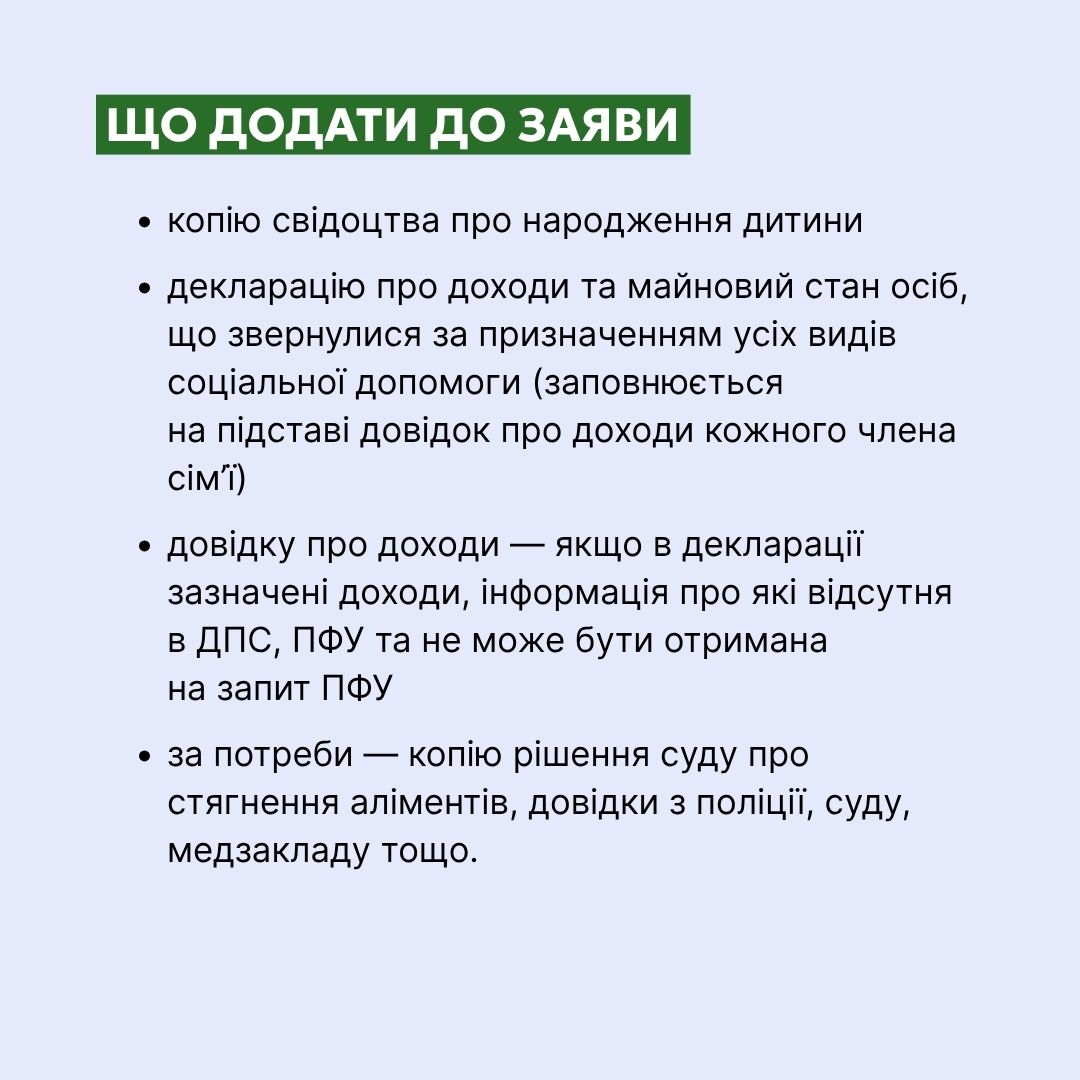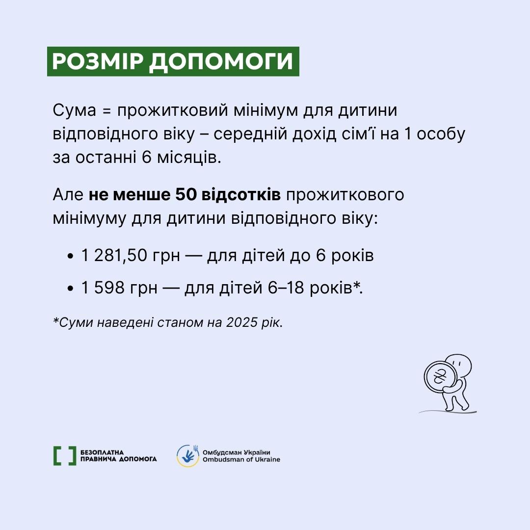 Допомогу виплачують до досягнення дитиною 18 років, а її розмір залежить від матеріального стану сім’ї, у якій виховується дитина. Детальніше про умови — у картках