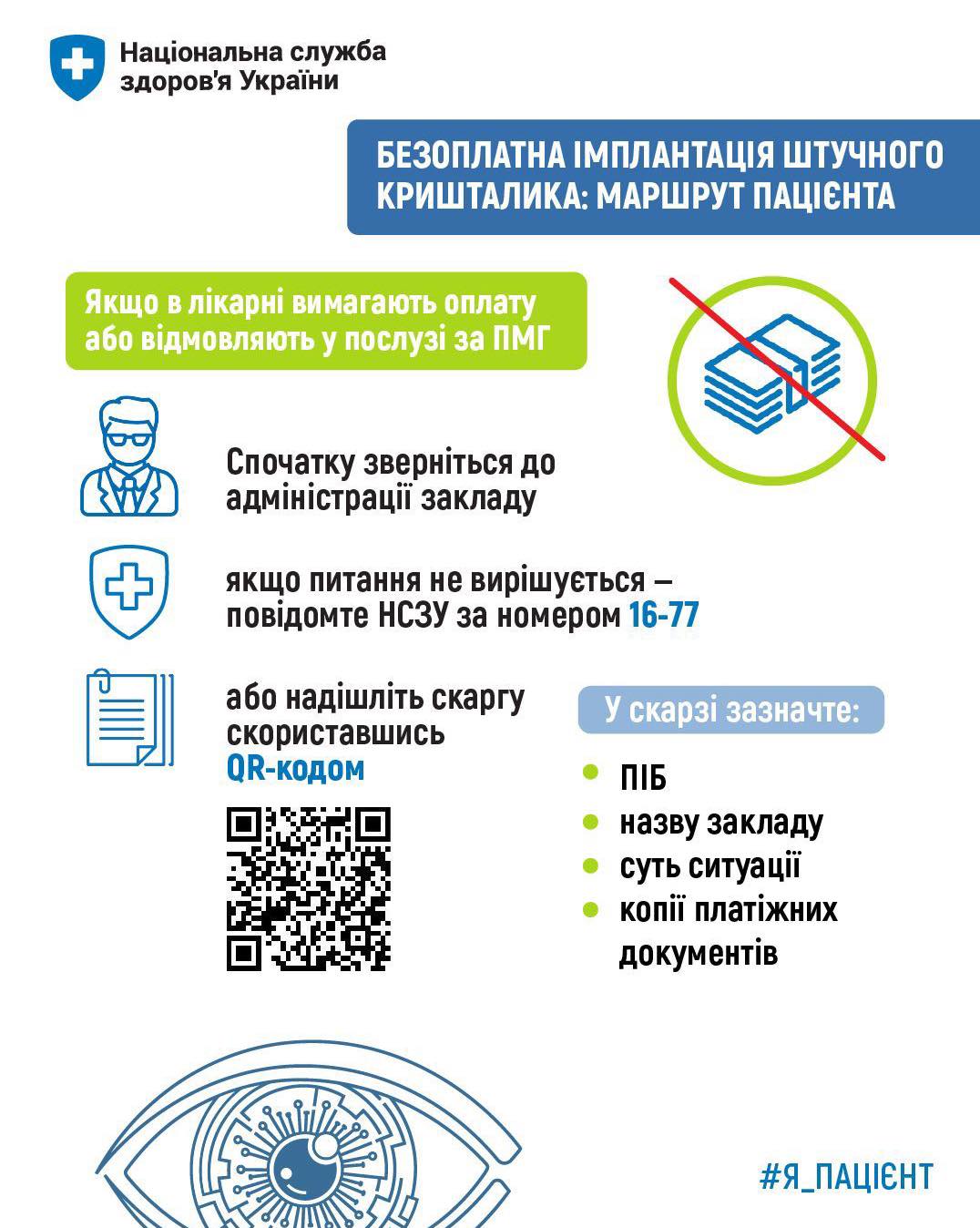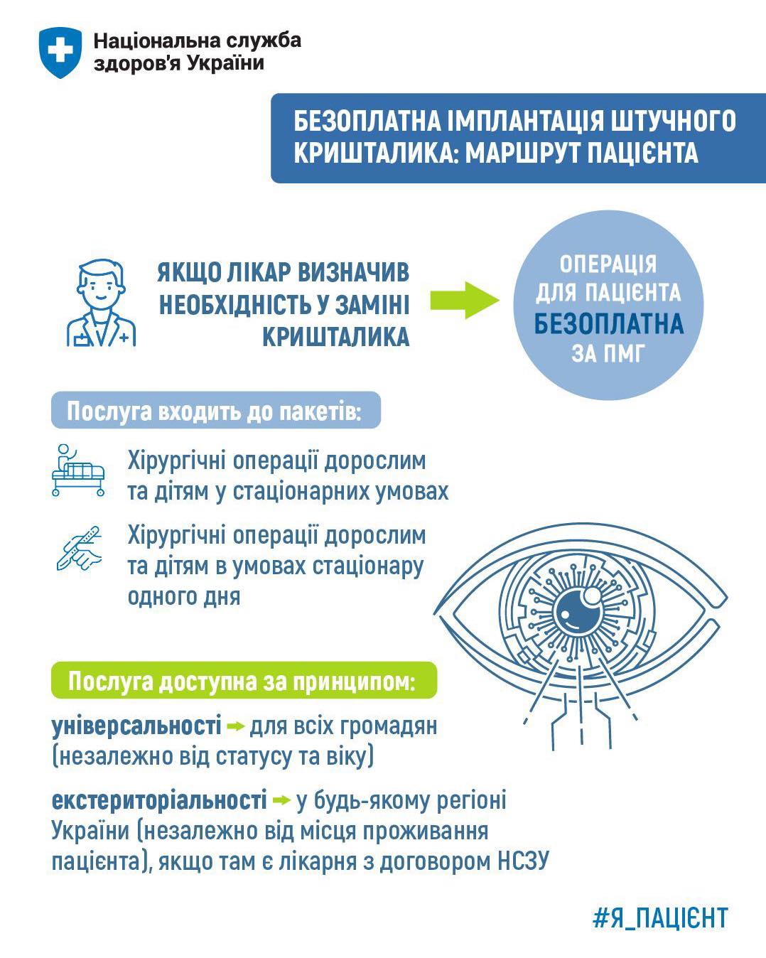 Операція із заміни природного кришталика ока на спеціальний штучний імплант проводиться при катаракті — захворюванні, яке поступово погіршує зір та суттєво знижує якість життя людини. Така операція є безоплатною в межах Програми медичних гарантій. Послуга входить до пакетів хірургічної допомоги у стаціонарі або в умовах стаціонару одного дня. НСЗУ оплачує лікарні за медичну послугу з хірургічного лікування катаракти в межах відповідного пакета ПМГ 28 441 грн. У 2025 році послугою зі встановлення штучного кришталика за Програмою медичних гарантій скористалися 25 118 пацієнтів.