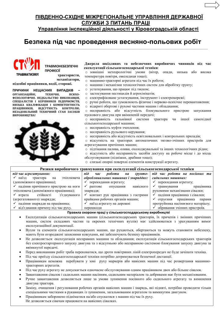 В рамках проведення цільових інформаційних заходів з безпеки праці в агропромисловому комплексі, які наразі проводить Державна служба з питань праці, інформуємо суб’єктів господарювання про проведення профілактичної роботи із запобігання виробничому травматизму, дотримання нормативних актів з охорони праці та забезпечення безпеки під час проведення весняно-польових робіт.