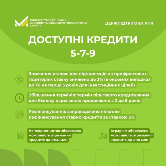Міністерство економіки , довкілля та сільського господарства України повідомляє, що ключовим інструментом підтримки залишається державна програма пільгового кредитування «Доступні кредити 5-7-9».