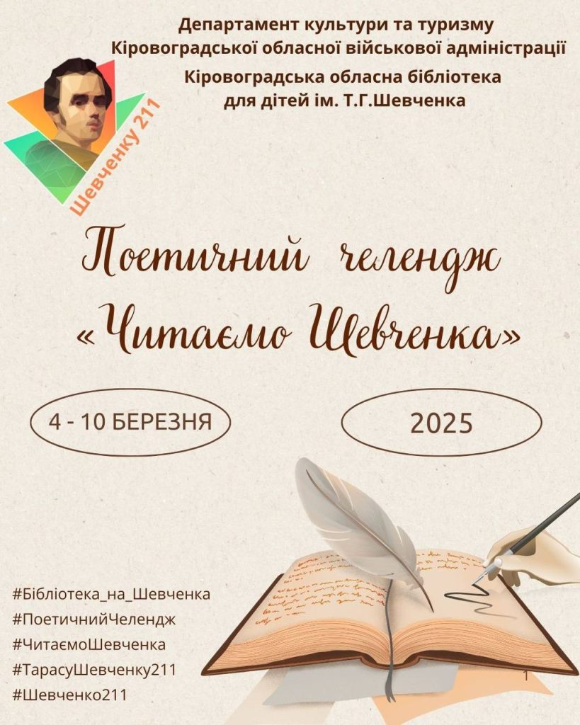 Кіровоградська обласна бібліотека для дітей ім. Т.Г. Шевченка за сприяння Департаменту культури та туризму Кіровоградської ОВА розпочинає поетичний челендж «Читаємо Шевченка» з нагоди відзначення 211-річниці від дня народження Великого Кобзаря.
