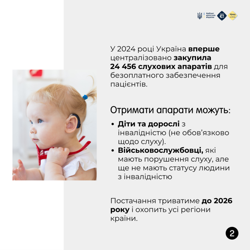 У 2024 році Україна вперше централізовано закупила понад 24 тисячі слухових апаратів. Безоплатно їх можуть отримати діти, дорослі з інвалідністю та військові з порушенням слуху.