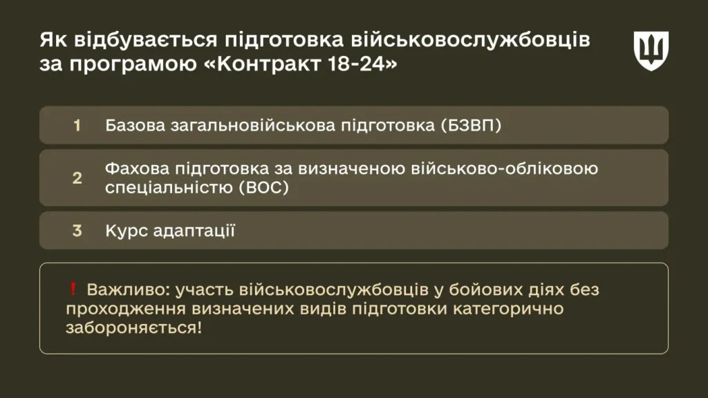 Таким чином повний цикл підготовки військовослужбовців триває до 3 місяців. Критично важливо: участь військовослужбовців у бойових діях без проходження визначених видів підготовки категорично забороняється!