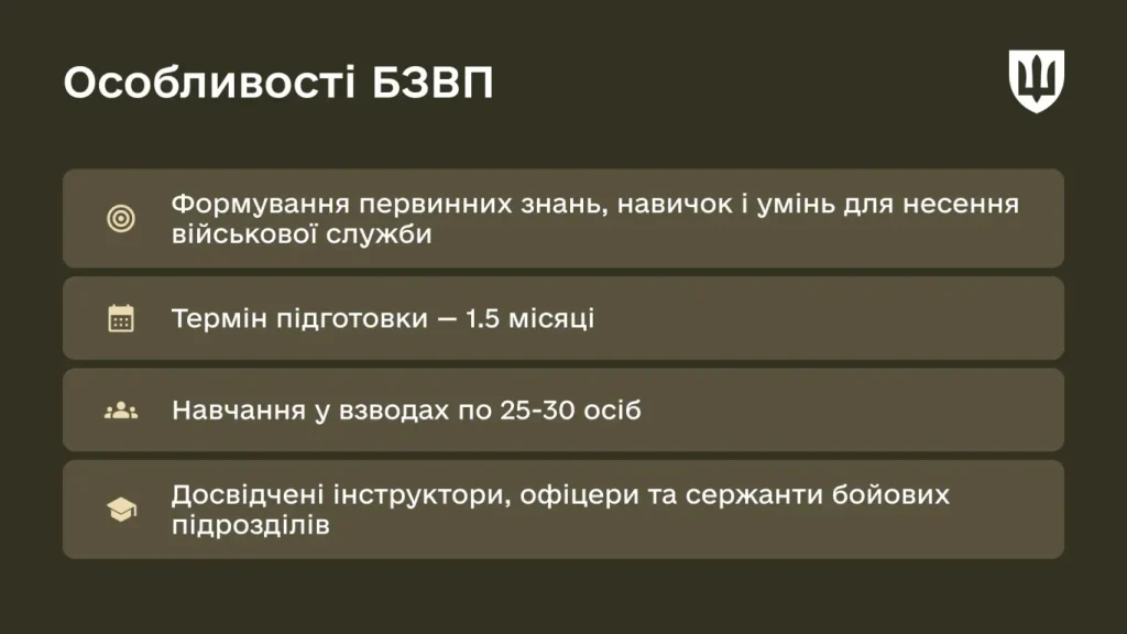 БЗВП є обов’язковою для осіб без попереднього військового досвіду та спрямована на набуття первинних знань, навичок і умінь, необхідних для виконання обов’язків військової служби. Підготовка триває 1.5 місяці за програмою, затвердженою Головнокомандувачем ЗС України.