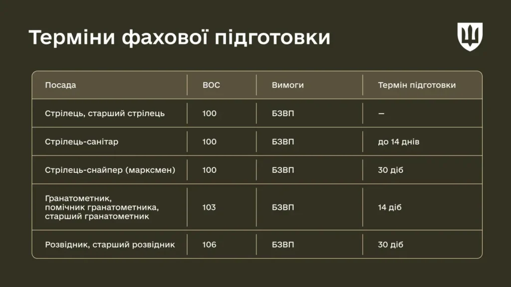 - фахова підготовка за визначеною військово-обліковою спеціальністю (ВОС);