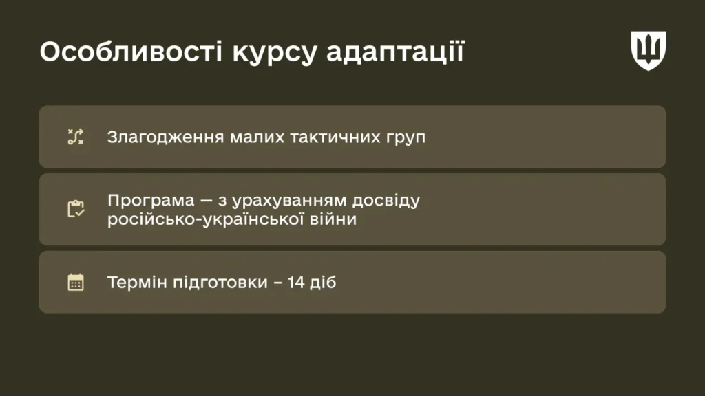 Курс адаптації спрямований на вдосконалення навичок узгоджених дій у складі малих тактичних груп в умовах напруженої психологічної напруги бойових дій. Програма навчання розроблена з урахуванням досвіду російсько-української війни і затверджена начальником Генерального штабу ЗСУ.