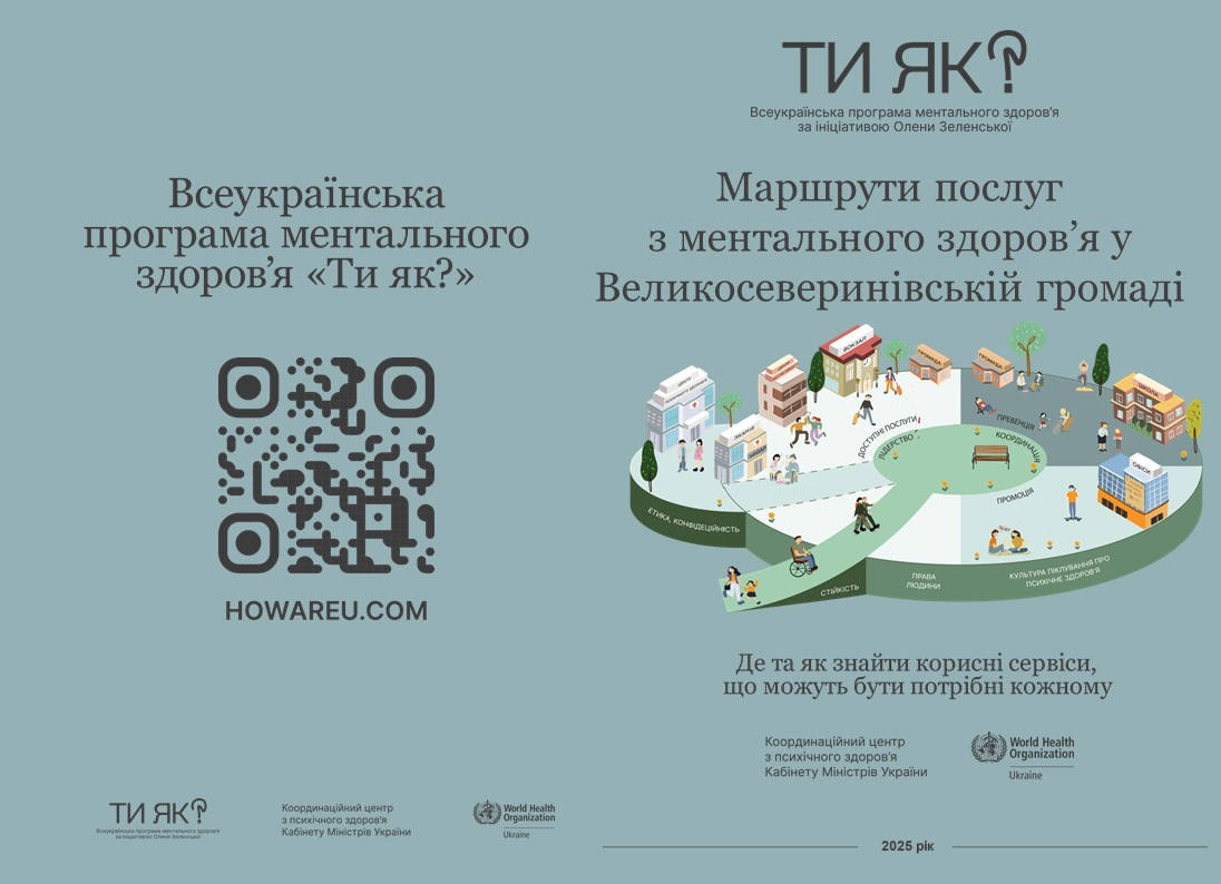 «Маршрути послуг з ментального здоров’я у Великосеверинівській громаді» – це універсальний посібник для кожного жителя громади. В одному виданні зібрана інформація про всі послуги з ментального здоров’я на території.