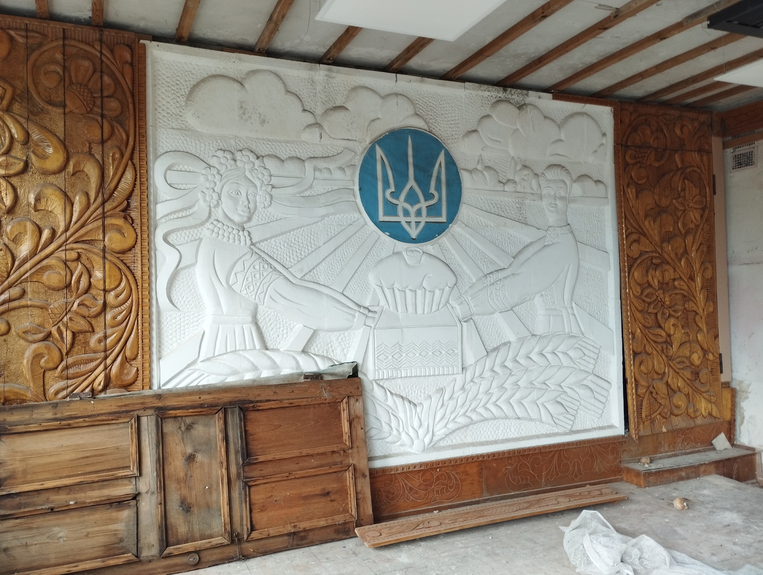 Тим часом заходимо до актової зали Будинку культури. Радянські плакати, старі декорації, вкрита шаром пилу сцена. Тут час ніби завмер. Попри нову покрівлю, всередині стеля будинку виглядає плачевно.
