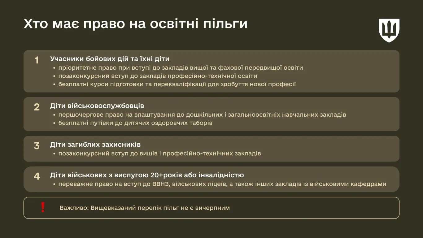 Головна Освіта і культура Освітні пільги для військовослужбовців, учасників бойових дій та членів їхніх родин 2