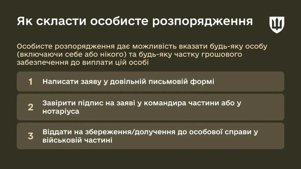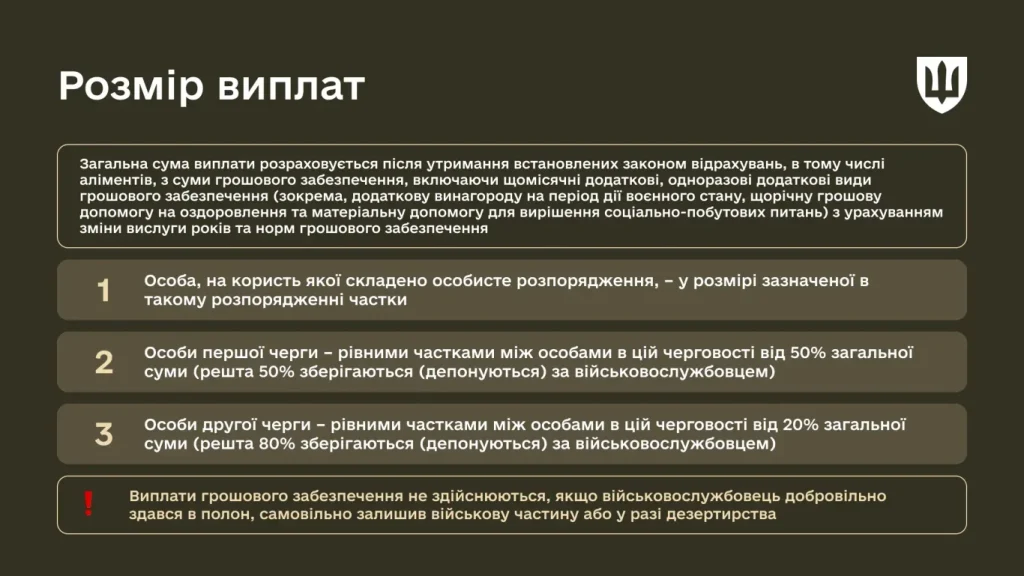 Виплати призначаються не автоматично, а конкретним людям. Насамперед це може бути особа або декілька осіб, яких військовослужбовець завчасно вказав у особистому розпорядженні.