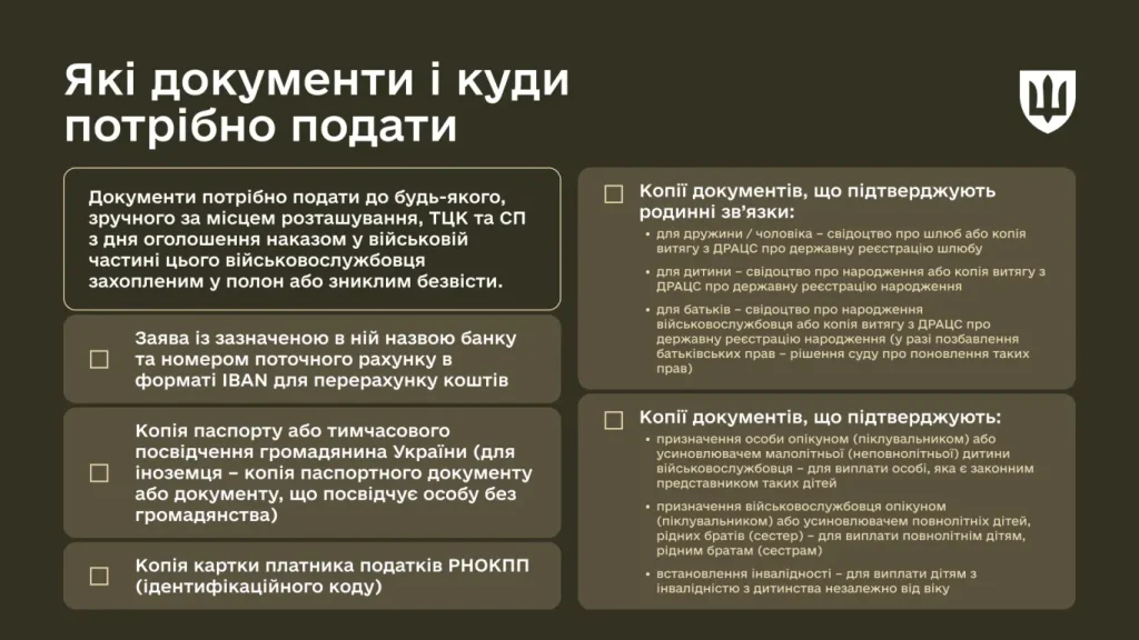 Після того, як військовослужбовця наказом командира частини оголошено захопленим у полон або зниклим безвісти, документи слід подати до будь-якого зручного за місцем розташування ТЦК та СП, незалежно від місця реєстрації.