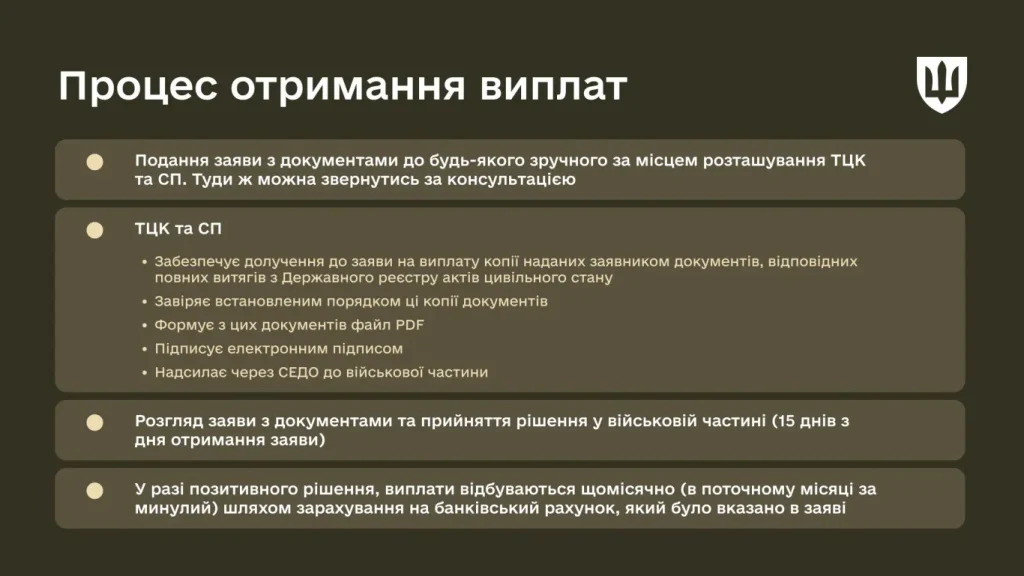 ТЦК та СП забезпечує долучення до заяви на виплату копії наданих заявником документів, відповідних повних витягів з Державного реєстру актів цивільного стану, завіряє встановленим порядком ці копії документів, формує з цих документів файл PDF, підписує електронним підписом та подає через СЕДО до військової частини.