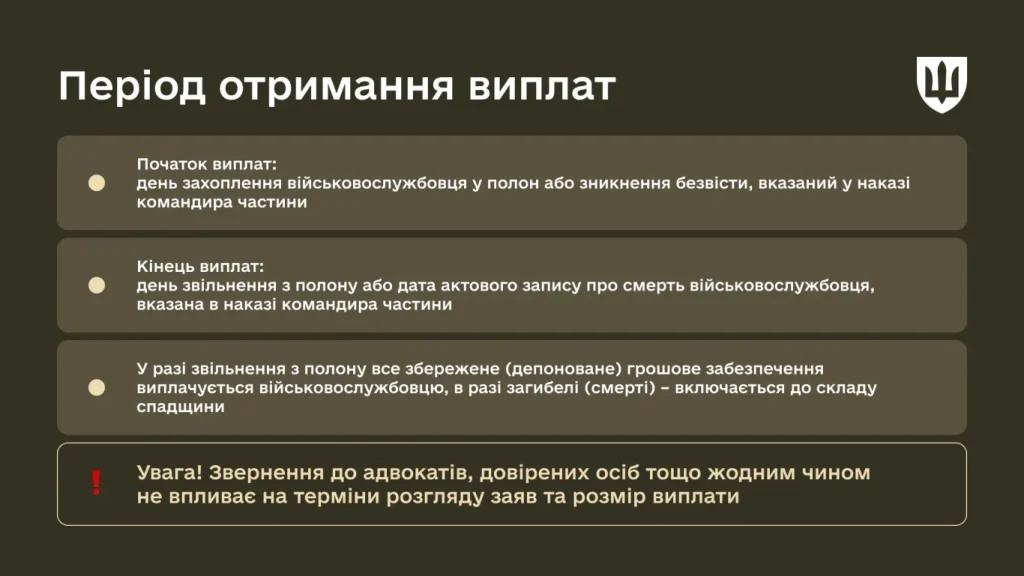 Важливо! Виплати не здійснюються, якщо військовослужбовець добровільно здався в полон, самовільно залишив військову частину або в разі його дезертирства.