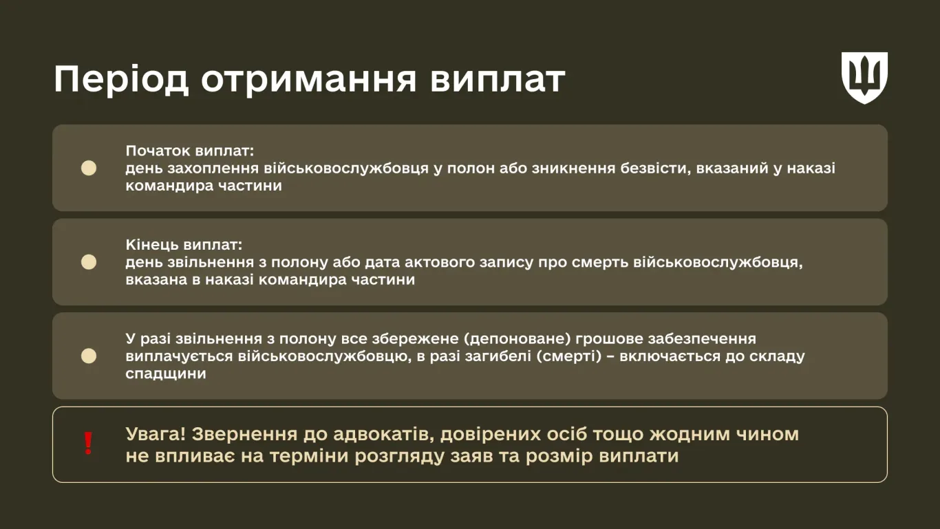 Головна Новини Порядок виплати грошового забезпечення військовослужбовцям, які перебувають у полоні, є заручниками, інтерновані в нейтральних державах або зникли безвісти 7