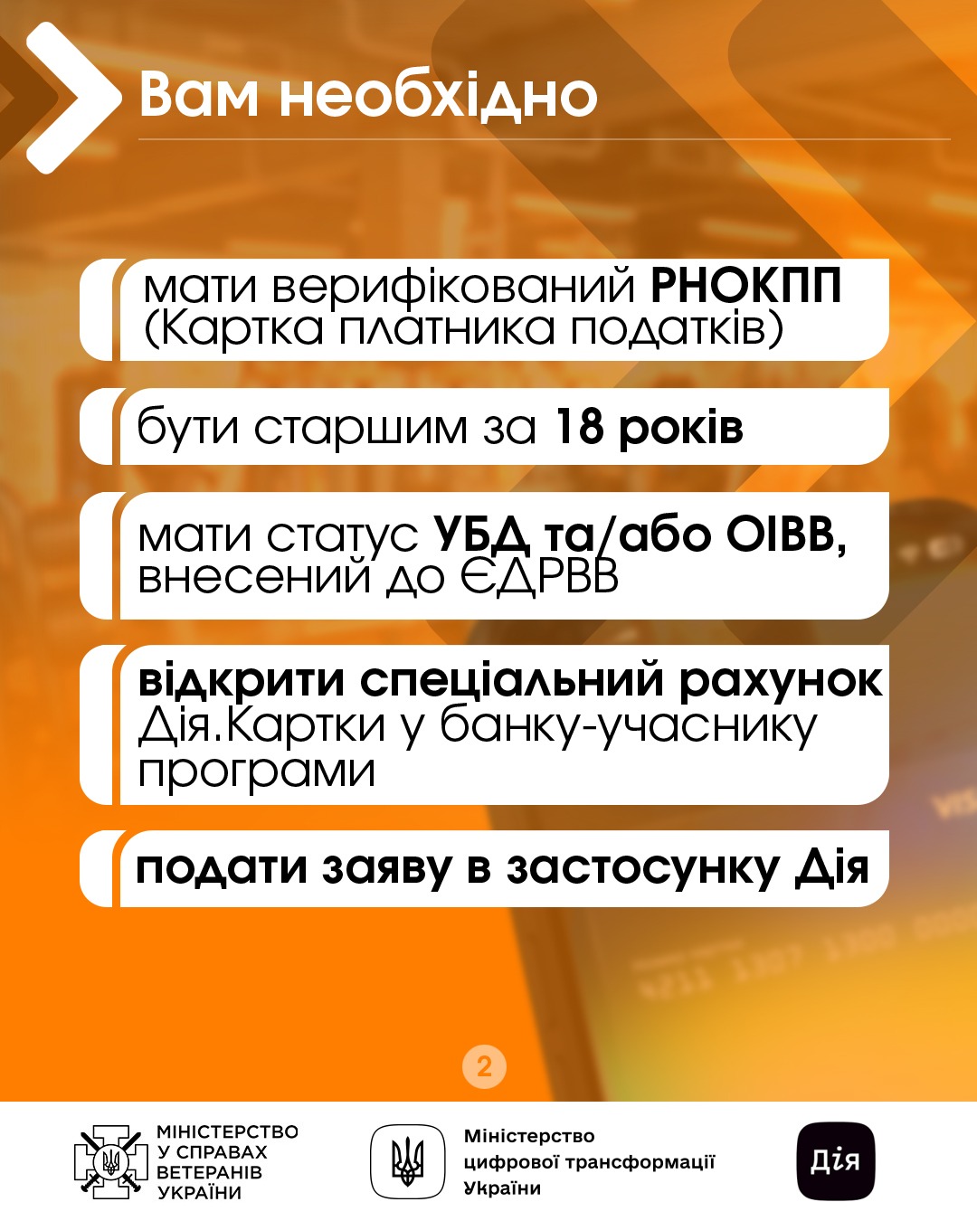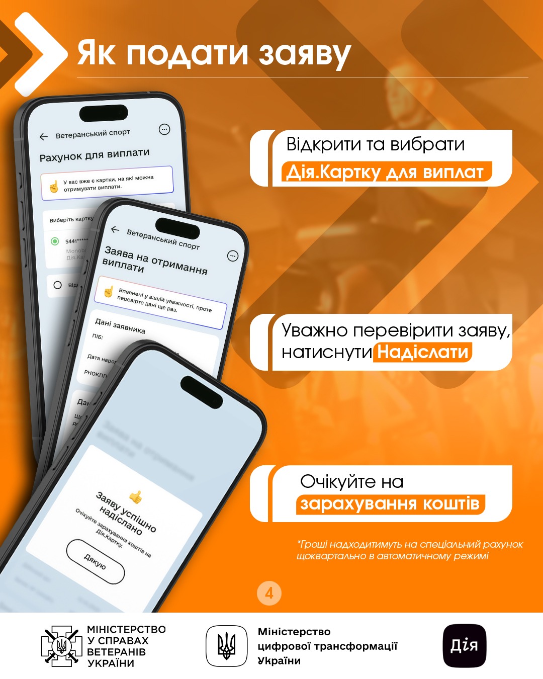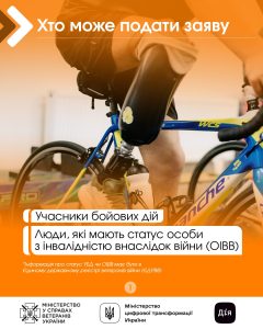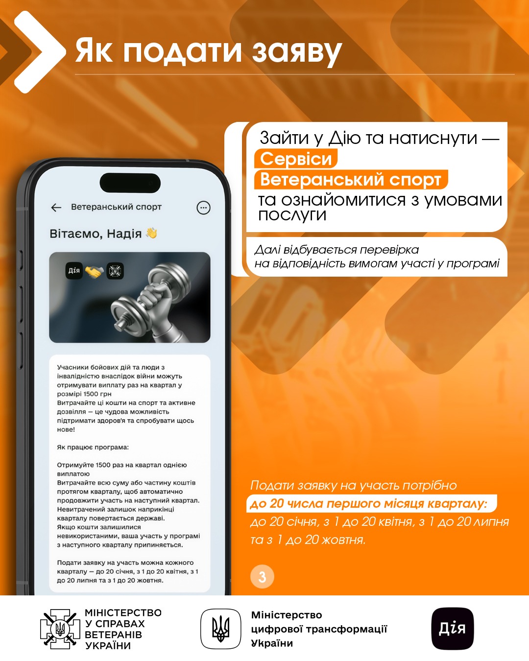 Управління у справах ветеранів обласної військової адміністрації повідомляє, що відповідно до постанови Кабінету Міністрів України від 03 січня 2025 року №2 «Про реалізацію експериментального проекту щодо надання учасникам бойових дій та особам з інвалідністю внаслідок війни допомоги для занять фізичною культурою та спортом» у період з 01 до 20 липня 2025 року буде здійснюватися прийом заявок для участі у реалізації програми розвитку ветеранського спорту.