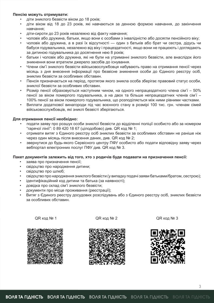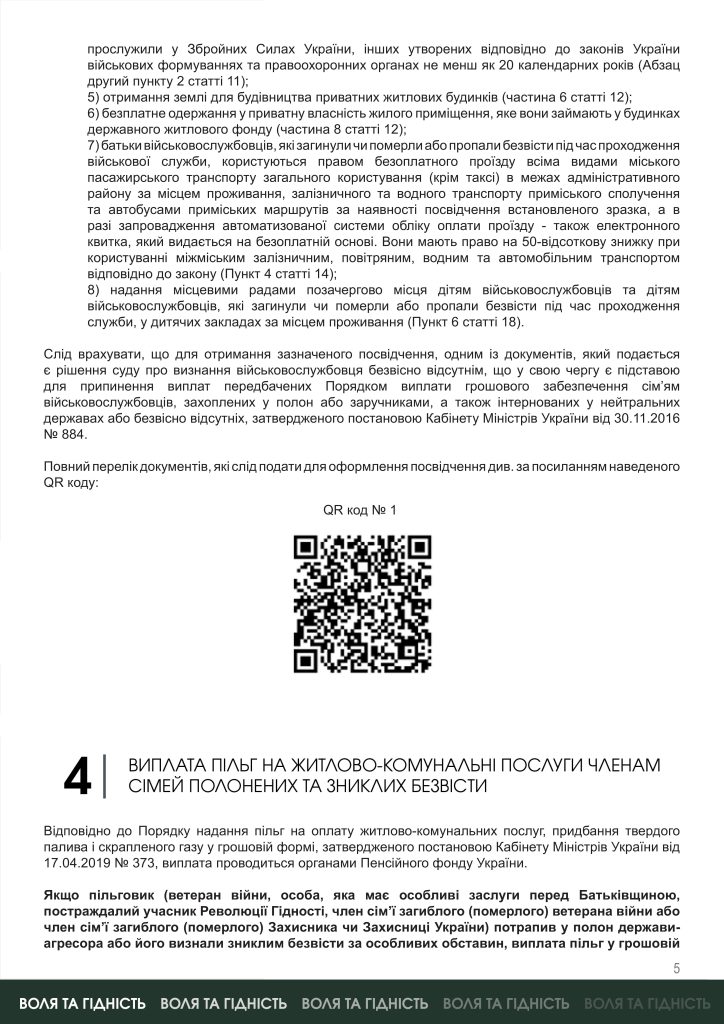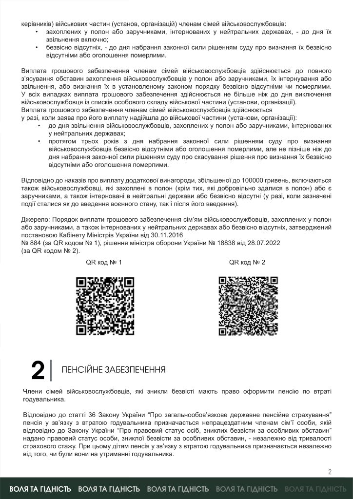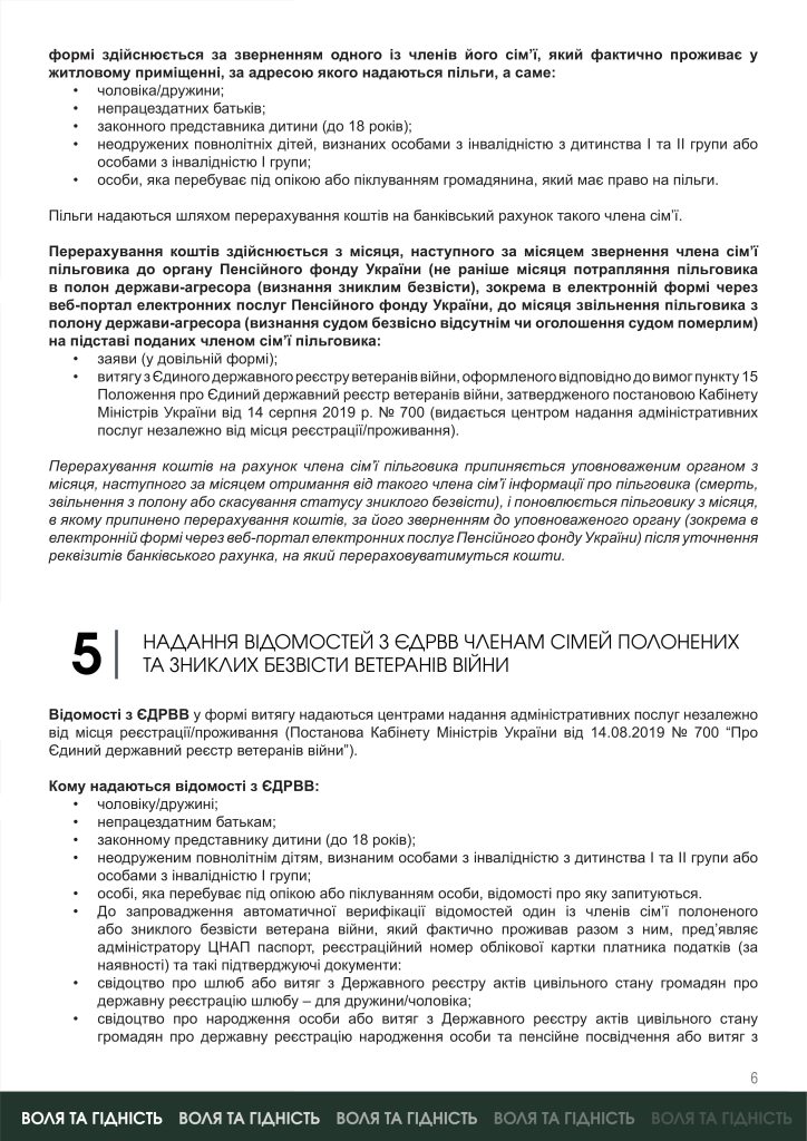 Для членів сімей полонених або зниклих безвісти ветеранів війни Мінветеранів підготувало інформаційні матеріали про їхні права на отримання соціальної підтримки, пенсійне забезпечення, виплату грошового забезпечення, пільги на ЖКП та отримання витягу з ЄДРВВ .