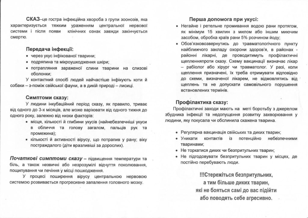1) забезпечити дотримання заходів профілактики сказу тварин (планова щорічна вакцинація проти сказу домашніх тварин);