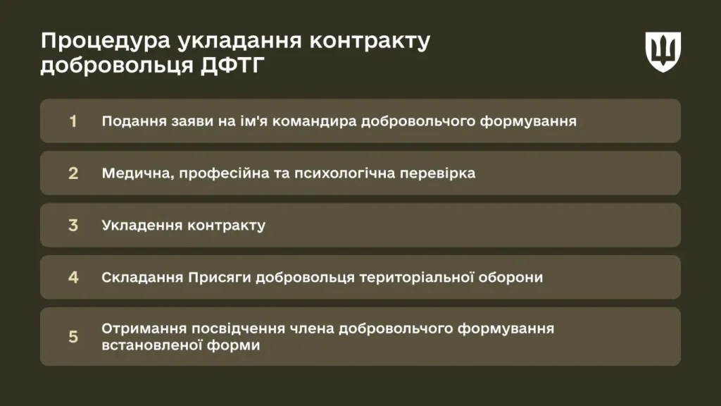 - Укладення контракту. Після ухвалення рішення командиром добровольчого формування про зарахування до членства з особою укладається контракт добровольця територіальної оборони. Контракт укладається за формою, затвердженою Наказом Міністерства оборони України № 84 від 07.03.2022 року.