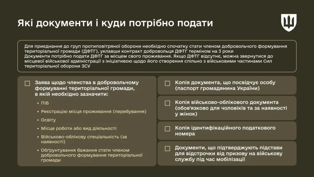 Для вступу до складу групи протиповітряної оборони необхідно бути учасником ДФТГ і мати відповідним чином укладений контракт члена добровольчого формування територіальної громади.