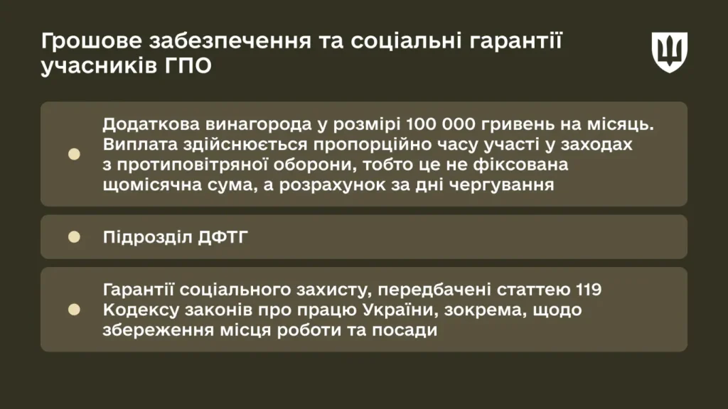 Учасники ГПО мають право на отримання додаткової винагороди у розмірі 100 000 гривень на місяць. Виплата здійснюється пропорційно часу участі у заходах з протиповітряної оборони, тобто це не фіксована щомісячна сума, а розрахунок за дні чергування.