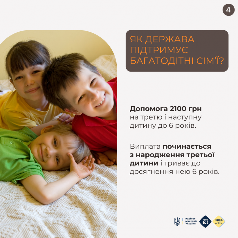 Багатодітні сім’ї в Україні мають низку пільг і підтримку від держави. Родини, які виховують трьох і більше дітей, мають право на 50% знижку на комунальні послуги, безкоштовні ліки за рецептами та проїзд у громадському транспорті для дітей. Крім того, держава надає щомісячну допомогу у розмірі 2100 гривень на третю та наступну дитину до 6 років.