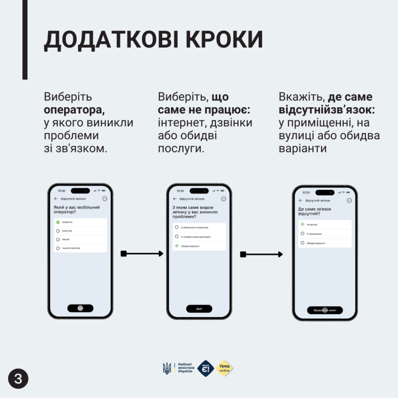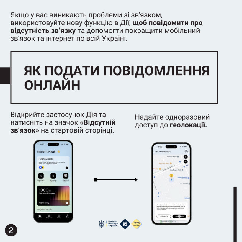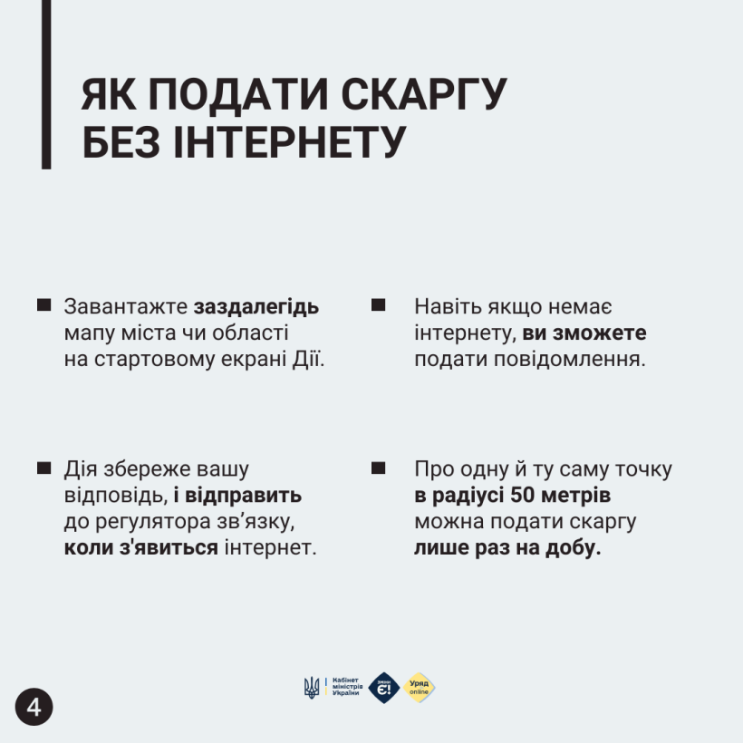 У застосунку Дія можна повідомити про відсутність мобільного зв’язку чи інтернету. Достатньо надати доступ до геолокації та обрати, які саме послуги не працюють. Повідомлення можна залишити навіть без інтернету – воно буде надіслане пізніше.