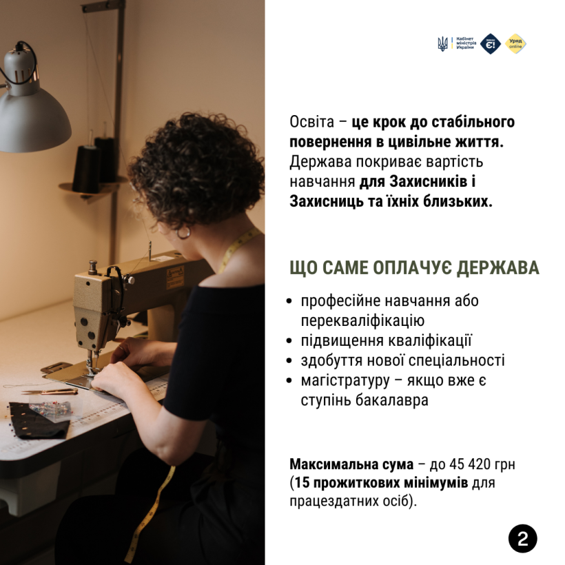 Ветерани, їхні рідні та родини загиблих Захисників можуть безоплатно пройти професійне навчання, перекваліфікацію чи вступити до магістратури. Держава покриває витрати до 45 420 грн.
