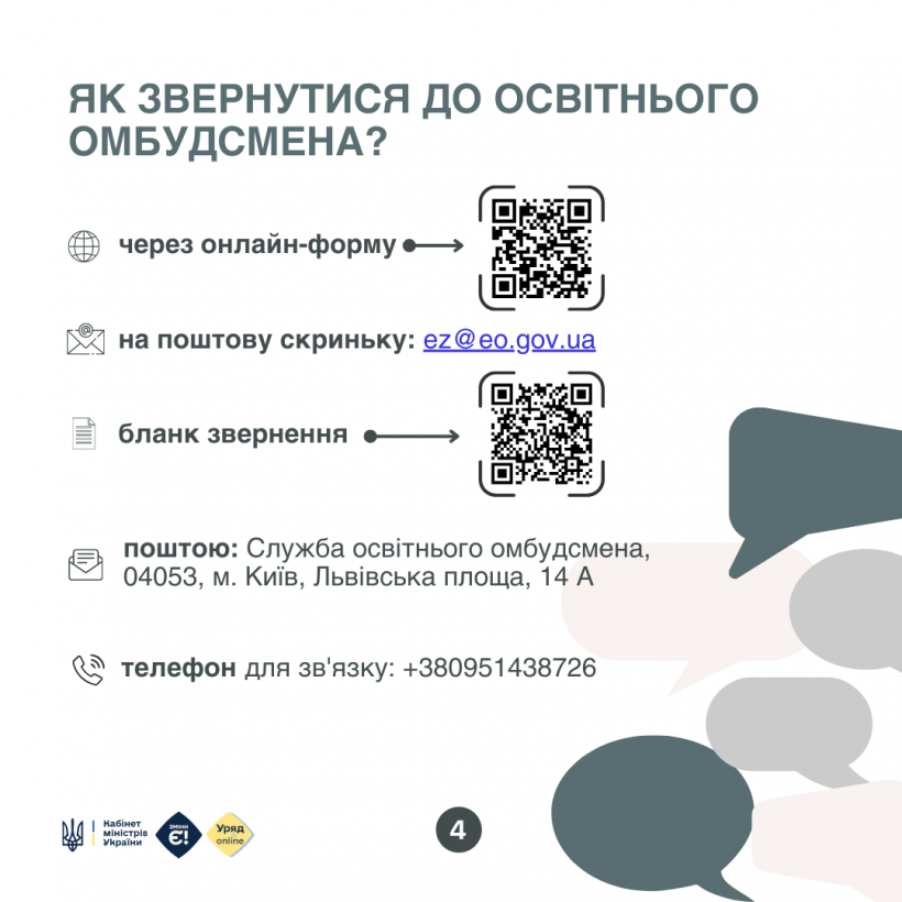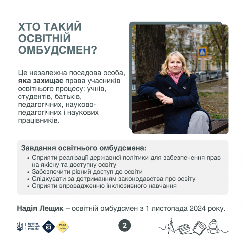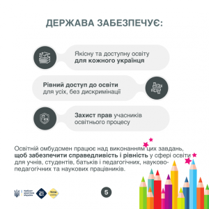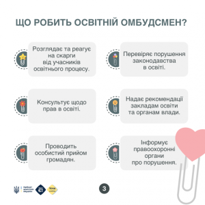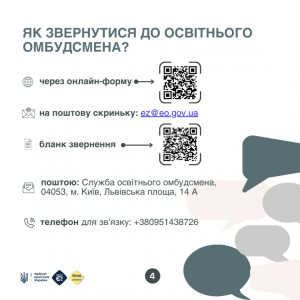 Українці можуть звернутися до освітнього омбудсмена. Він розглядає скарги, консультує та допомагає забезпечити якісну освіту для кожного. Це незалежний захисник інтересів учнів, студентів, батьків та викладачів.