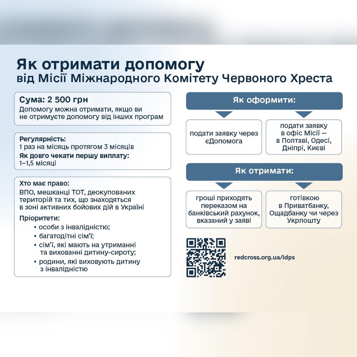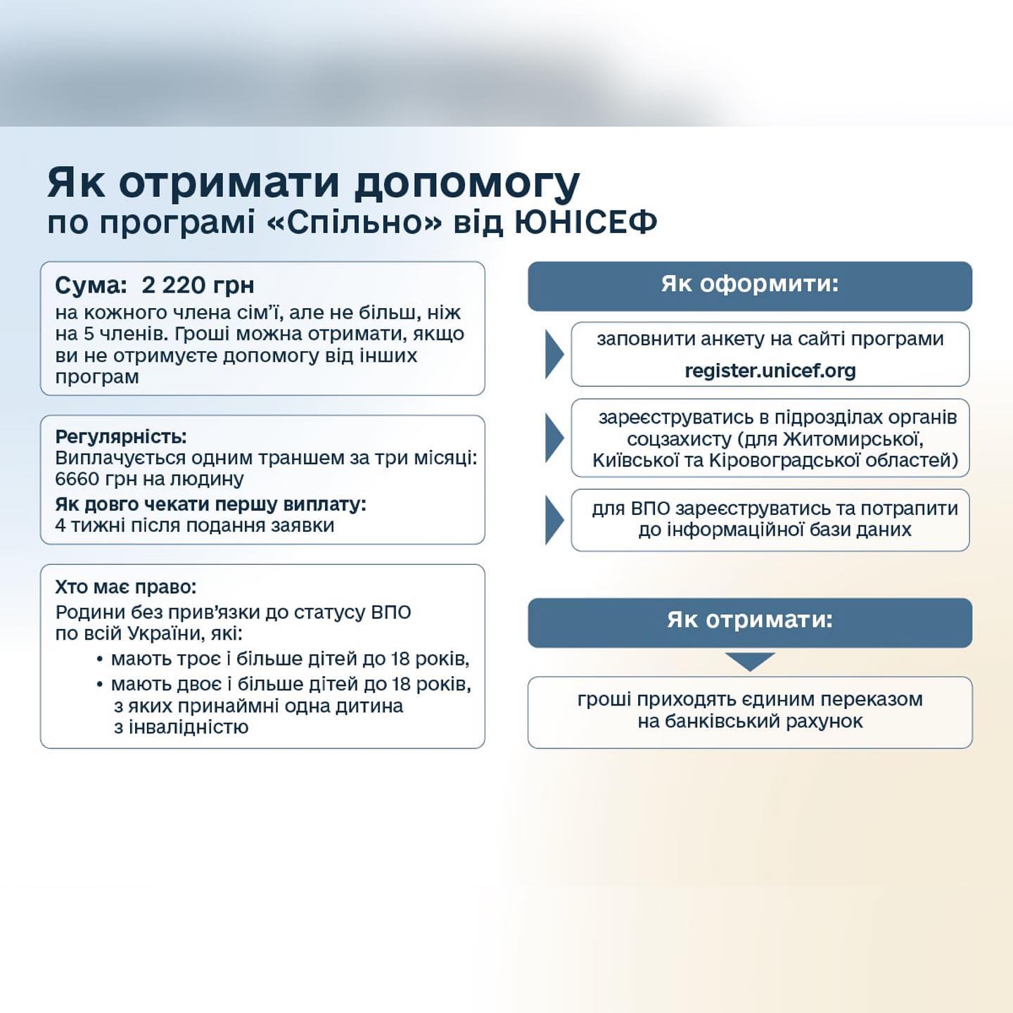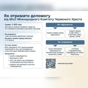 Крім державної фінансової допомоги, наші співгромадяни можуть скористатися підтримкою відомих міжнародних організацій. В Україні працюють їх програми підтримки. Пропонується разова або щомісячна допомога на строк до 3 місяців – з розрахунку від 2220 до 2500 грн на кожного члена сім’ї на місяць.