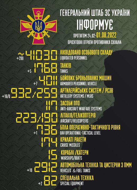 Головна Новини Загальні бойові втрати противника з 24.02 по 01.08