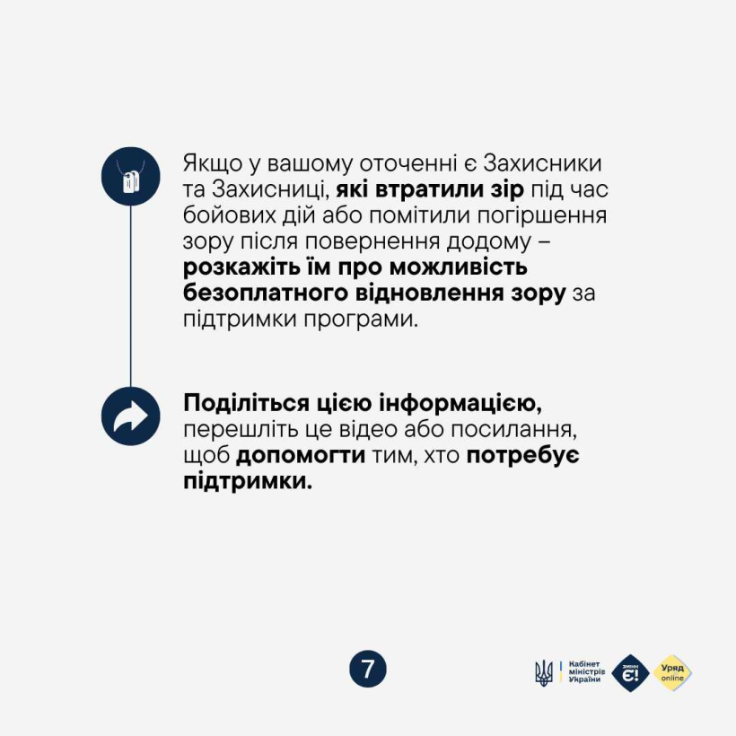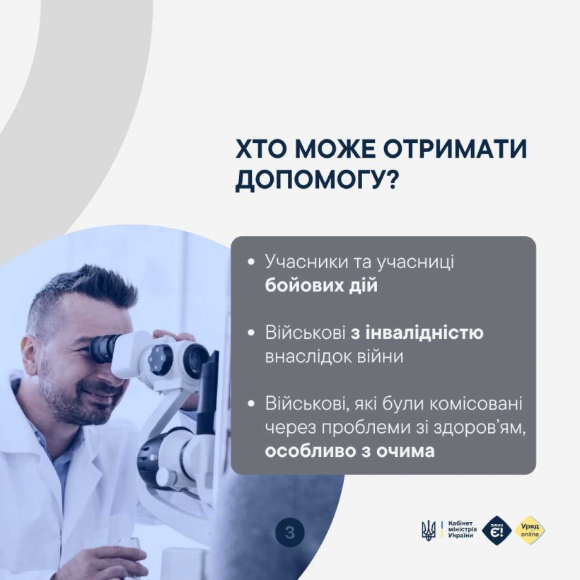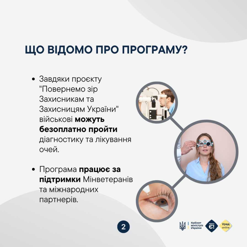 Українські військові можуть безоплатно пройти діагностику та лікування очей. Послуги доступні для Захисників і Захисниць, які втратили зір під час бойових дій або відчули його погіршення після повернення додому.