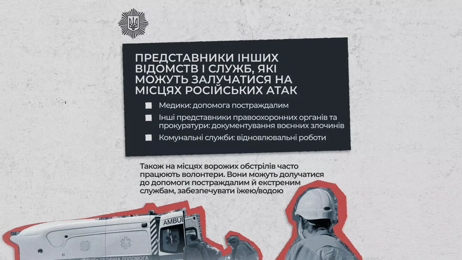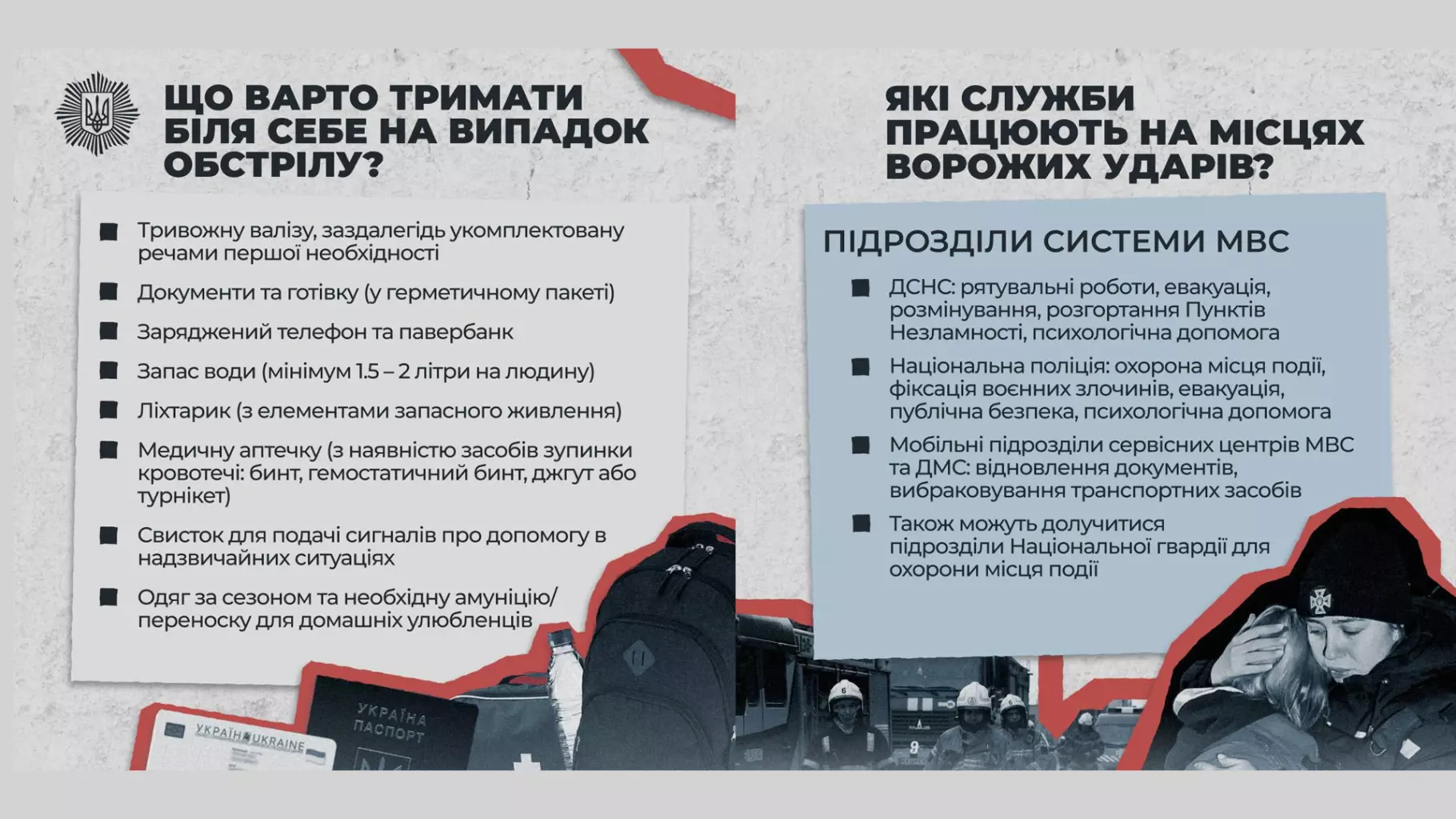 Також розповідаємо, які підрозділи МВС та інших служб працюють на місцях ударів і як вони можуть допомогти у критичній ситуації.